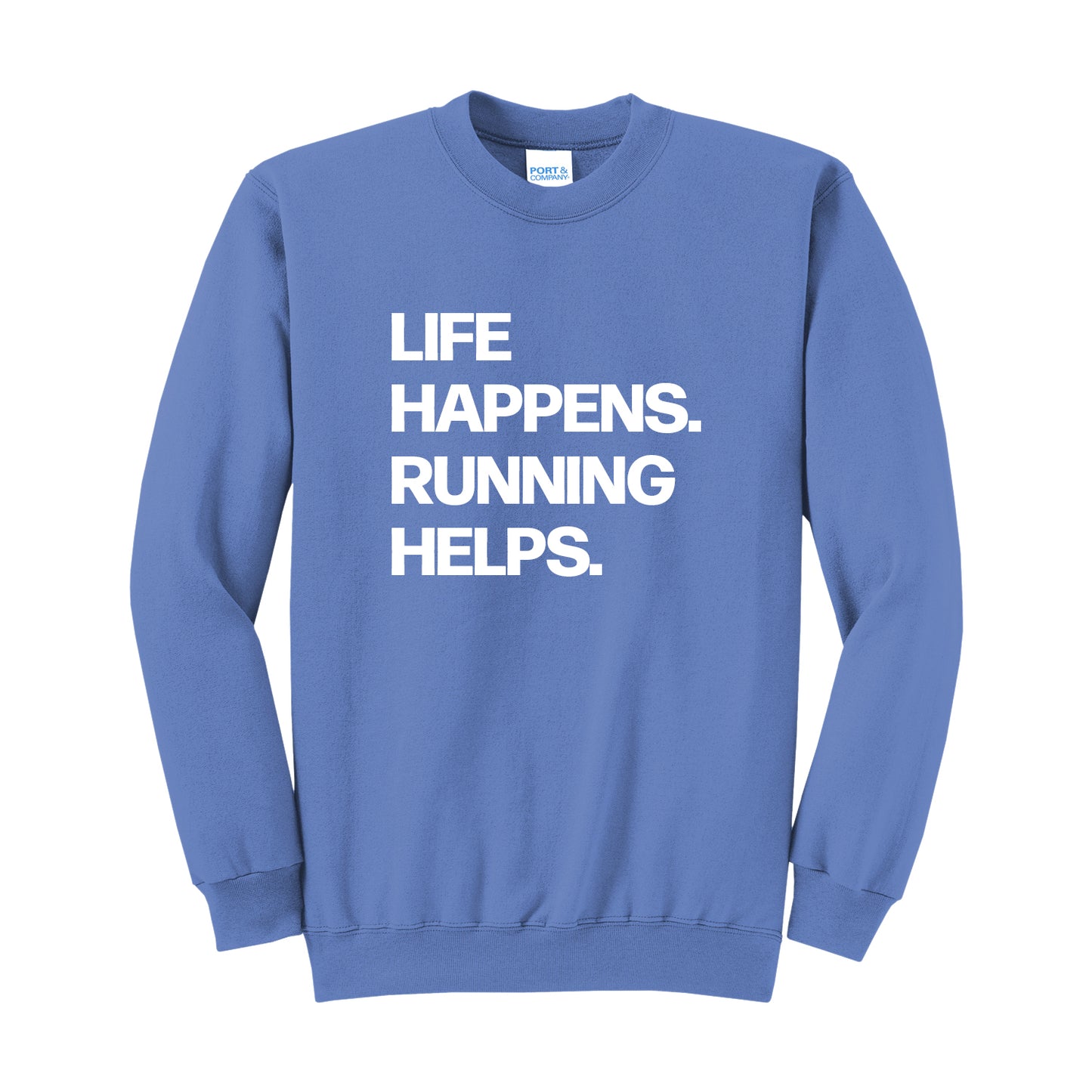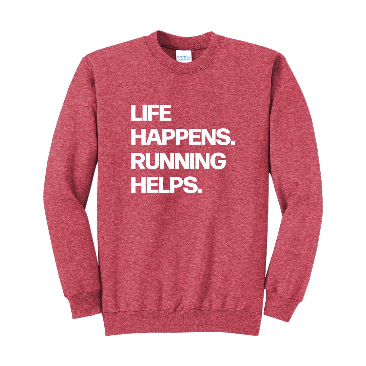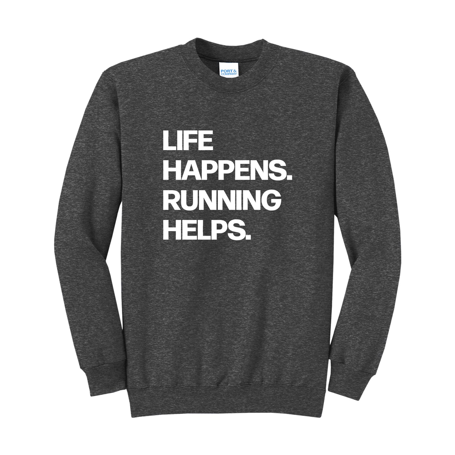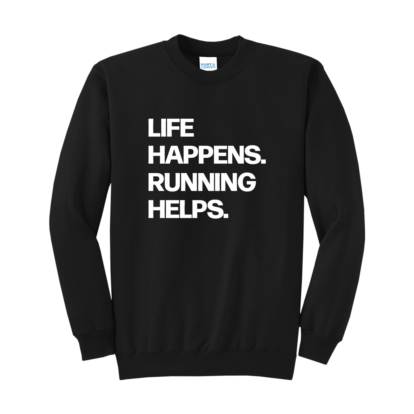 Life Happens. Running Helps. Our soft, comfortable, unisex crew is perfect for any occasion. From hanging out with friends to relaxing post run, stay comfortable anytime.